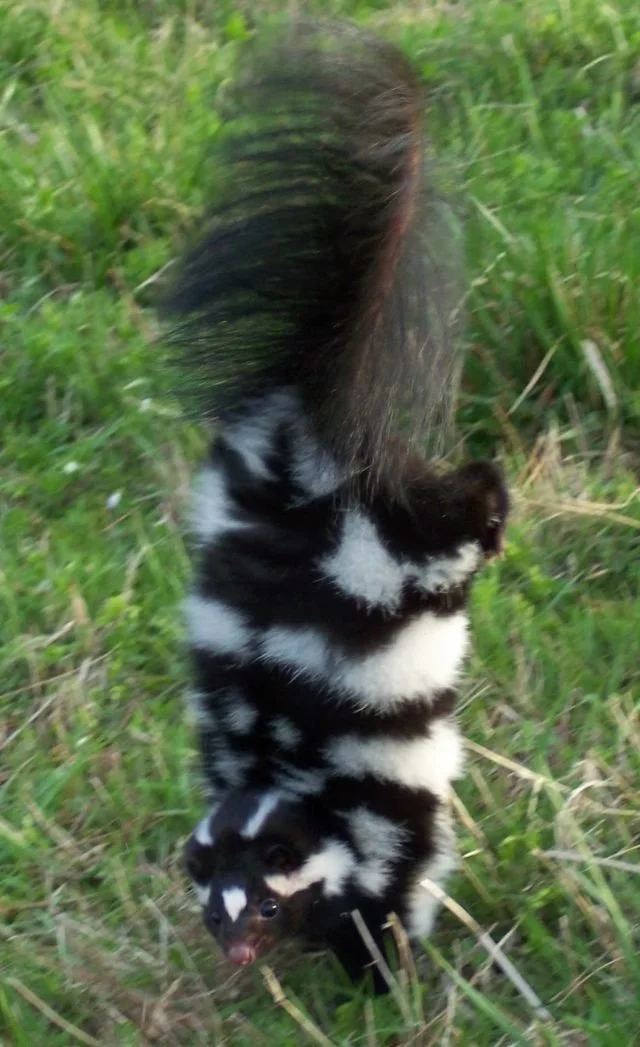 That’s because it’s breeding season for our striped friend Mephitis mephitis and it’s less often seen, eastern spotted cousin, Spilogale putorius.